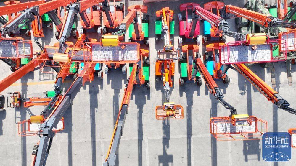 ↑ 12月15日,在位于浙江省湖州市德清县雷甸镇的浙江鼎力机械股份有限公司,c交流群工人对准备出口的新臂式智能高空作业平台设备进行检测(无人机照片)。新华社发(谢尚国摄)