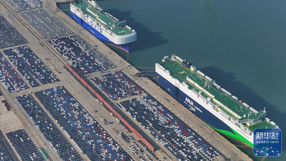 ↑ 12月15日,国产汽车在山东港口烟台港集结等待装船出口(无人机照片)。新华社发(唐克摄)