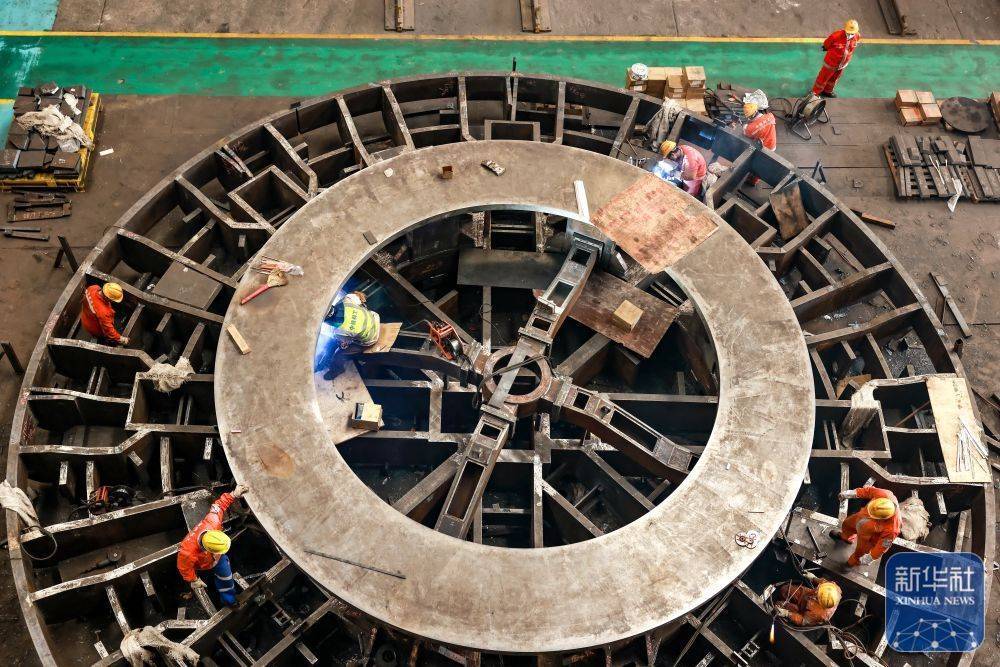 ↑ 12月15日,中铁科工集团武汉江夏制造基地技术工人对盾构机配件进行装配作业。新华社发(赵军摄)